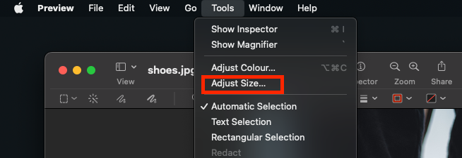 - From the top toolbar select Tools>Adjust Size