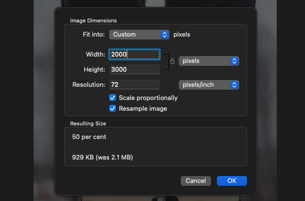 Like the example above the default Mac "preview" app has resizing tools inbuilt for quick and easy resizing. However unlike above this method directly overwrites the file (so save a copy beforehand if you which to retain the original!)