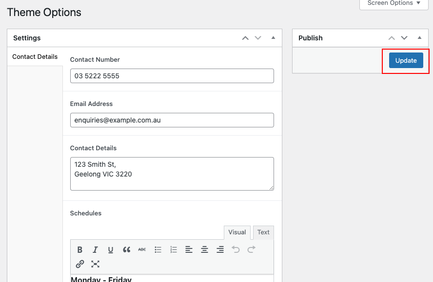 Once in the options page, all global settings can be found in the relevant tabs, for contact and address details, social links and more. Once altered be sure to click update for changes to take effect.